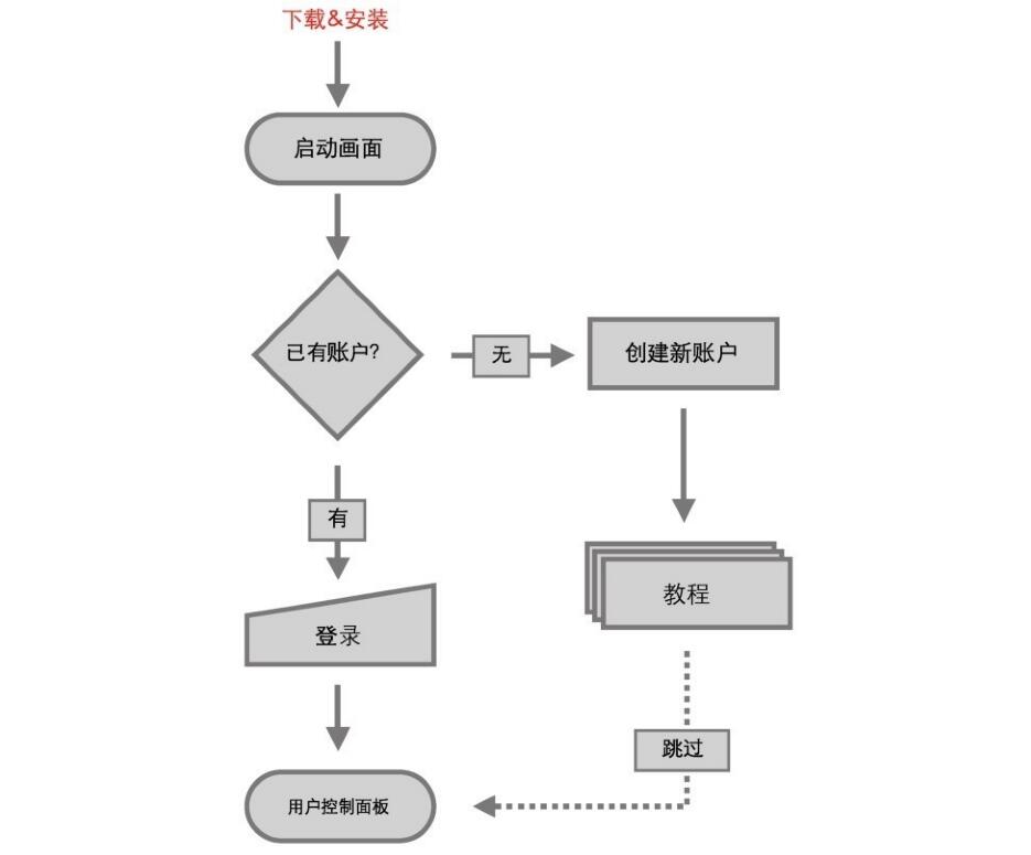 (圖6)下面是一個簡單流程圖演示,見圖7。這個流程圖表達的是,當用戶安裝一個APP時的預期體驗,這里的主要任務是確定用戶已有賬戶或創(chuàng)建一個新賬戶。從這張圖中我們可以看出,每個矩形代表一個頁面或任務。最開始的部分是下載并安裝APP。文檔的讀者只需跟著箭頭指示就可以查看用戶的可用選項以及他們做出決定和輸入數(shù)據(jù)之后的后續(xù)步驟。(圖7)