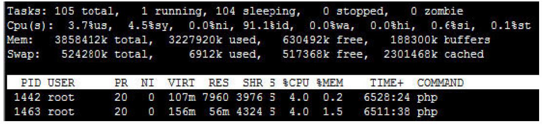 如圖4.2所示是UCloud上top命令的截圖,由圖上可獲知UCloud上的Liuux系統(tǒng)是設(shè)置了Swap分區(qū),Linux系統(tǒng)在內(nèi)存不足的情況下會(huì)使用Swap分區(qū),這時(shí)整個(gè)系統(tǒng)的性能急降。如果使用top命令觀察到Swap上used值不用為0,那運(yùn)維人員需要小心了,used值不用為。意味著內(nèi)存已經(jīng)不足。這時(shí)運(yùn)維人員先排查有沒(méi)有不正常使用內(nèi)存的程序,如果沒(méi)找到的程序就意味內(nèi)存已經(jīng)不足以應(yīng)對(duì)業(yè)務(wù)的發(fā)展,需要升級(jí)內(nèi)存。
