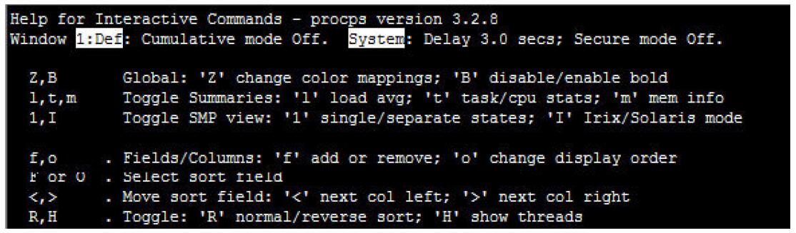 在top命令中輸入“h”,可看到top命令的詳細(xì)幫助,如圖4-5所示。