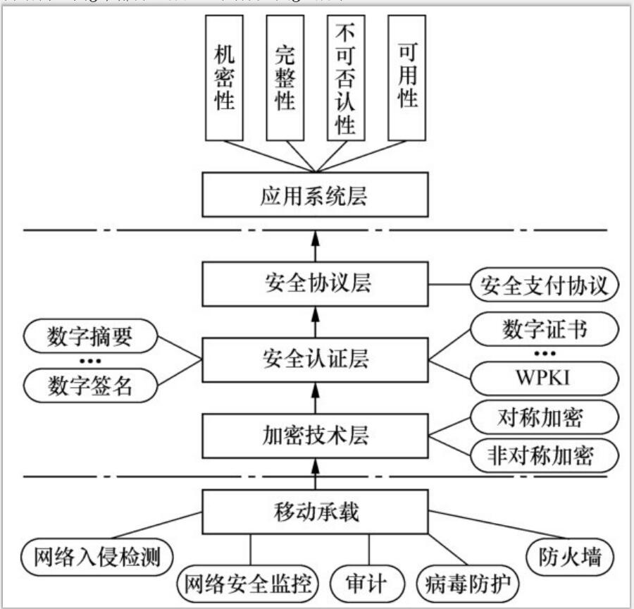 的方式,并為移動(dòng)電子商務(wù)系統(tǒng)提供基本、靈活的網(wǎng)絡(luò)服務(wù)。為了向移動(dòng)電子商務(wù)系統(tǒng)提供可靠的安全保障,必須建立完善的加密機(jī)制和認(rèn)證機(jī)制。在圖3-1所示的移動(dòng)電子商務(wù)安全框架體系中,加密技術(shù)層、安全認(rèn)證層、安全協(xié)議層致力于保證電子交易數(shù)據(jù)的安全性。其中,安全協(xié)議層是加密技術(shù)層與安全認(rèn)證層的綜合運(yùn)用和完善,安全協(xié)議主要是指安全套接層(SecureSocket Layer, SSL) 協(xié)議、WTLS、安全電子交易( Secure ElectronicTransaction, SET) 協(xié)議以及安全支付協(xié)議等。移動(dòng)電子商務(wù)安全已受到越來(lái)越多用戶(hù)的普遍關(guān)注,雖然用于保證移動(dòng)電子商務(wù)安全性的技術(shù)不少,但通過(guò)簡(jiǎn)單組合這些技術(shù),無(wú)法獲取可靠的安全性,必須合理應(yīng)用安全控制技術(shù),并對(duì)其進(jìn)行有機(jī)結(jié)合,才能從技術(shù)上實(shí)現(xiàn)系統(tǒng)且有效的移動(dòng)電子商務(wù)安全。
