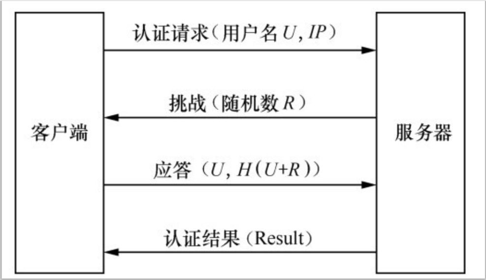 ⑤認證服務(wù)器收到后,將自己的計算結(jié)果H’(U+R)與應(yīng)答串H(U+R)作比較,如果二者相同,則認證成功通過,否則認證失敗;