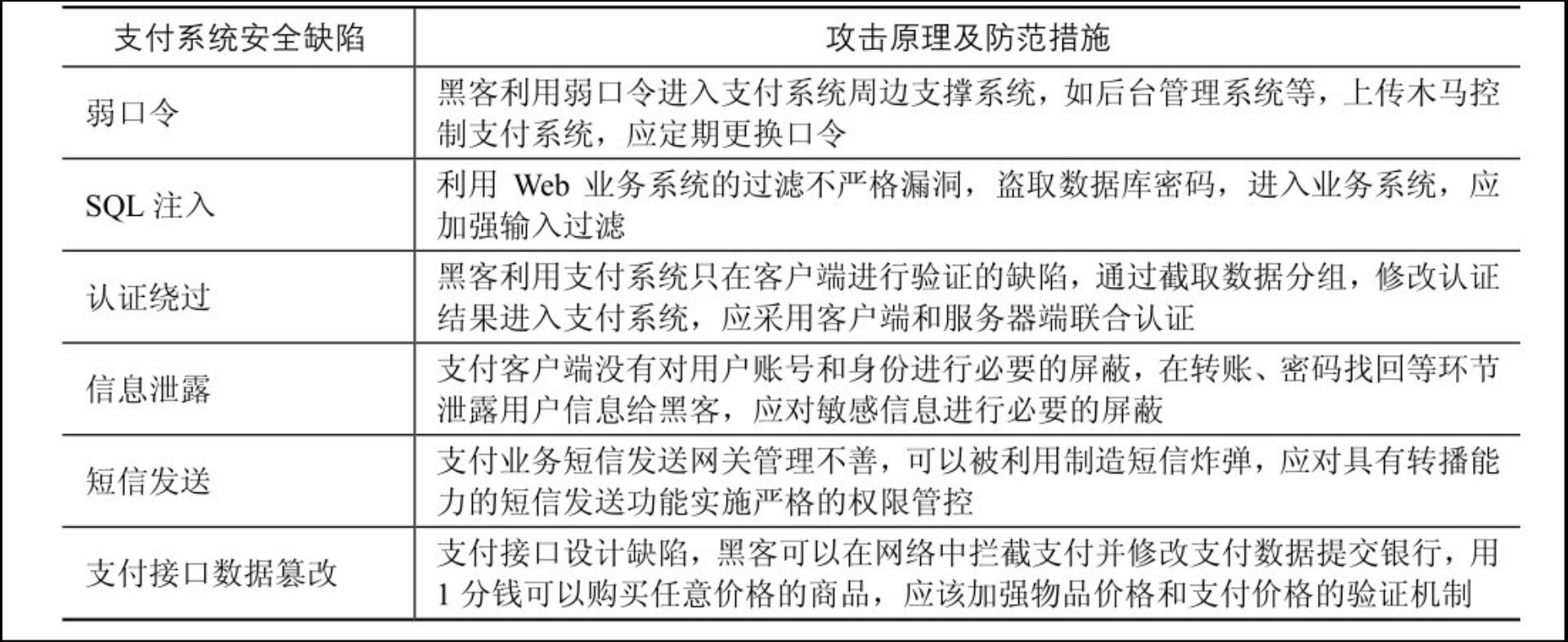 表7-2 常見的移動(dòng)支付系統(tǒng)安全缺陷