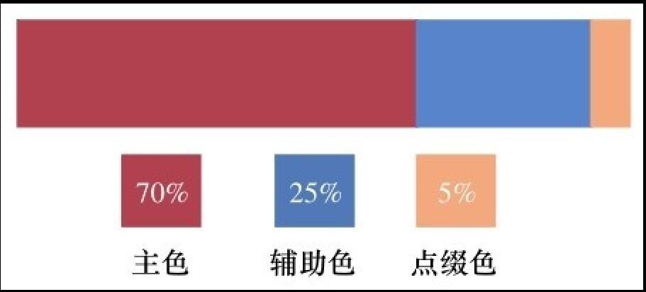 有不少賣(mài)家對(duì)移動(dòng)端店鋪?lái)?yè)面的裝修有一個(gè)認(rèn)識(shí)誤區(qū),以為頁(yè)面越花哨就越好看,其實(shí)過(guò)于花哨的頁(yè)面只能引起消費(fèi)者的視覺(jué)混亂。一般情況下,建議頁(yè)面色彩不要超過(guò)三種。三種指的是三種色相,如可以將深紅和暗紅視為一種色相。移動(dòng)端店鋪整體顏色一定要給人以統(tǒng)一、協(xié)調(diào)的感覺(jué)。統(tǒng)一的顏色是指主色調(diào)只有一種,在此基礎(chǔ)上搭配一些其他顏色,即所謂“總體協(xié)調(diào),局部對(duì)比”原則。配色黃金比例為70%∶25%∶5%,其中的70%為大面積使用的主色,25%為輔助色,5%為點(diǎn)綴色,如圖2-1所示。
