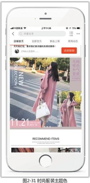 人們對于一個店鋪色彩的記憶往往更傾向于其包裝,包裝本身也代表著整個店鋪的風格定位。色彩有著自己的語言,可以喚起人們的心靈感知,所以在確定移動端店鋪主題色調(diào)時,應該注意與商品特性相符合,或與目標消費群體的特性相符合。如果店鋪主營18~30歲的女性時尚服飾,那么比較適合的主題色就是偏粉色、紅色的柔和浪漫色系,如圖2-31所示;如果店鋪主營手機、相機等數(shù)碼類產(chǎn)品,那么藍色、黑色和灰色系往往會給消費者以理智、高貴、沉穩(wěn)的感覺,如圖2-32所示。