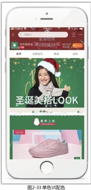 在移動端店鋪中,單色Ⅵ配色方案如圖2-33所示。店鋪Logo為單色,以該顏色作為整個店鋪的主色或輔色,可以使整個店鋪看起來上下呼應、干凈利落。