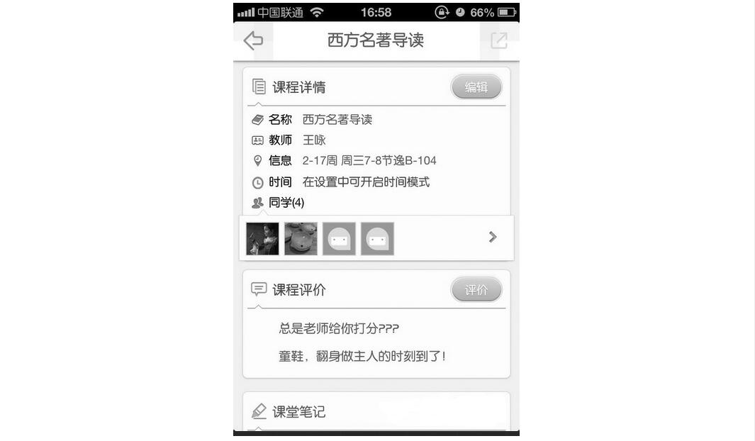 分享筆記在每節(jié)課的課程詳情版面中,同學(xué)們可以隨時添加自己的課程筆記,在給更多同上一節(jié)課的同學(xué)提供便利的同時,也能方便自己隨時隨地查看和管理筆記信息。特別是在iOS系統(tǒng)中,課程格子的分享筆記更是支持拍照上傳,讓用戶體驗更加豐富。此外,課程格子還可以對老師的課程與教學(xué)做出評價,給未來選課的同學(xué)提供更多的參考信息,如圖3.3所示。