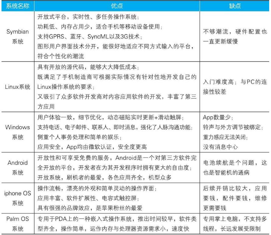 App全稱Application,是安裝在移動(dòng)智能設(shè)備上的一種第三方應(yīng)用程序的統(tǒng)稱。目前,比較常用的有蘋果的AppStore,谷歌的GooglePlayStore,微軟的Marketplace,以及黑莓用戶的BlackBerryAppWorld等。App的運(yùn)用需要一個(gè)平臺承載,承載App的平臺大致有6個(gè),分別為PalmOS系統(tǒng)、Symbian系統(tǒng)、WindowsCE系統(tǒng)、Linux系統(tǒng)、Android系統(tǒng)和iphoneOS系統(tǒng)。其中Symbian、WindowsCE和Android運(yùn)用較多,iphoneOS專屬蘋果應(yīng)用,Linux和Palm則相對較少。為了更好地區(qū)分這幾個(gè)平臺,接下來,我們就分別對各個(gè)系統(tǒng)進(jìn)行詳細(xì)分析,并總結(jié)出每種系統(tǒng)的優(yōu)勢和劣勢,以便讀者更好地了解和運(yùn)用,具體如表1-1所列。