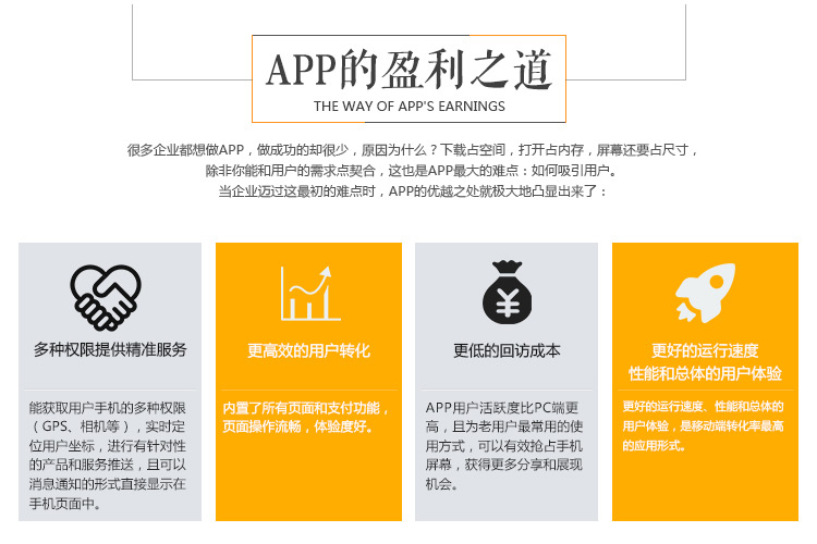 隨著APP應(yīng)用已經(jīng)滲透我們生活的方方面面,在App應(yīng)用市場(chǎng),每天都有數(shù)以萬(wàn)計(jì)的新App面世,競(jìng)爭(zhēng)的慘烈程度可想而知。成功的明星APP應(yīng)用也有很多,但據(jù)APPStore中顯示從未被下載過(guò),也從未獲得評(píng)分的“僵尸應(yīng)用”也不少。說(shuō)明一款A(yù)pp即使制作再精良、功能再齊全,如果不能被用戶發(fā)現(xiàn),就難逃淪為“僵尸應(yīng)用”的命運(yùn)。那企業(yè)開(kāi)發(fā)的APP怎樣才有可能成功呢?那就是做好推廣,只有讓APP讓更多用戶知道才有可能成功。