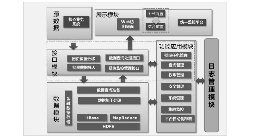首先系統(tǒng)上層,通過接口模塊和展示模塊,從外部系統(tǒng)獲取資源,然后將處理后的結(jié)果通過展示模塊進(jìn)行展示。系統(tǒng)中間處理層,會(huì)針對(duì)不同的業(yè)務(wù)需求提供不同的業(yè)務(wù)處理功能模塊,對(duì)數(shù)據(jù)進(jìn)行加工處理和數(shù)據(jù)算法挖掘,以便生成滿足需求的各種數(shù)據(jù)。系統(tǒng)底層,利用分布式系統(tǒng)基礎(chǔ)架構(gòu)平臺(tái)系統(tǒng),進(jìn)行數(shù)據(jù)大規(guī)模存儲(chǔ),提供HBase數(shù)據(jù)庫,進(jìn)行非結(jié)構(gòu)化的數(shù)據(jù)存儲(chǔ)。通常采用的功能模塊結(jié)構(gòu)如下圖所示。