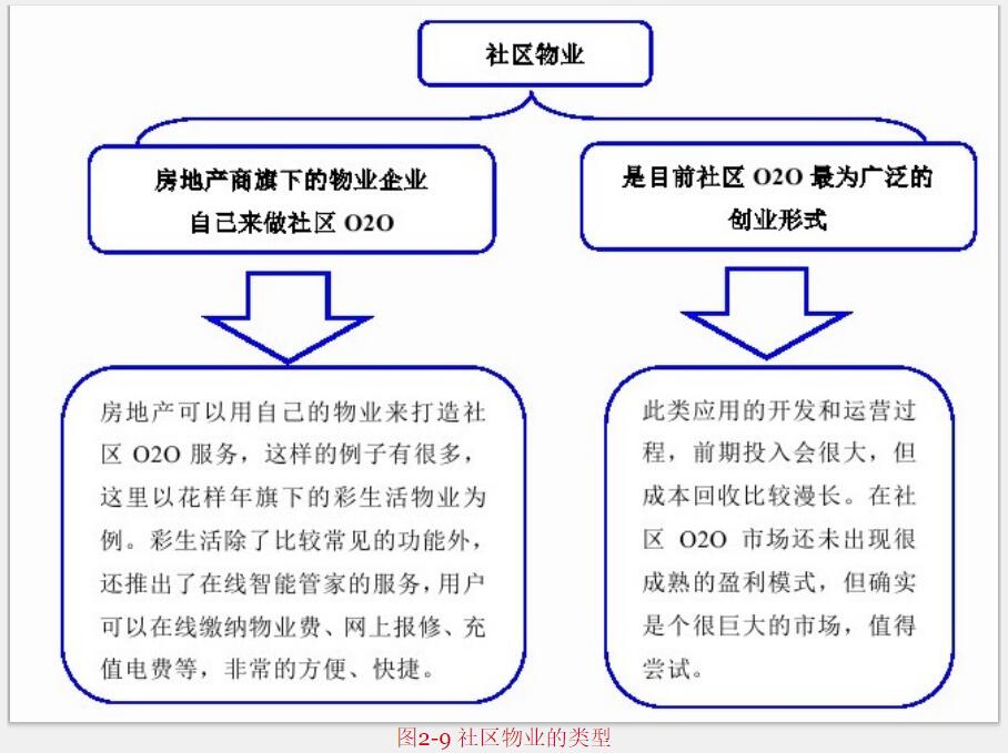 網(wǎng)站建設(shè)公司認(rèn)為移動(dòng)互聯(lián)網(wǎng)時(shí)代,社區(qū)成了企業(yè)的必爭(zhēng)之地,被創(chuàng)業(yè)公司、物業(yè)、互聯(lián)網(wǎng)巨頭以及房地產(chǎn)商緊緊地盯著。在社區(qū)O2O平臺(tái)里,相比之下,線上固然重要,但是線下的打造才是制勝的關(guān)鍵;從社區(qū)O2O運(yùn)營(yíng)情況來看,想要把物業(yè)放在一邊,和用戶建立聯(lián)系,以后如何落地是關(guān)鍵問題。因?yàn)樯鐓^(qū)居民本身沒有很強(qiáng)的意識(shí),物業(yè)企業(yè)相應(yīng)服務(wù)意識(shí)也做得遠(yuǎn)遠(yuǎn)不夠。在這樣的情況下,要做好社區(qū)O2O,一定不能繞開物業(yè)。社區(qū)O2O服務(wù)把互聯(lián)網(wǎng)思維植入到了物業(yè)中,這樣的服務(wù),是對(duì)傳統(tǒng)物業(yè)的商業(yè)模式的挑戰(zhàn)和顛覆,是否如此,大家可以拭目以待。目前,物業(yè)類社區(qū)O2O主要分為兩種形式,如圖2-9所示。