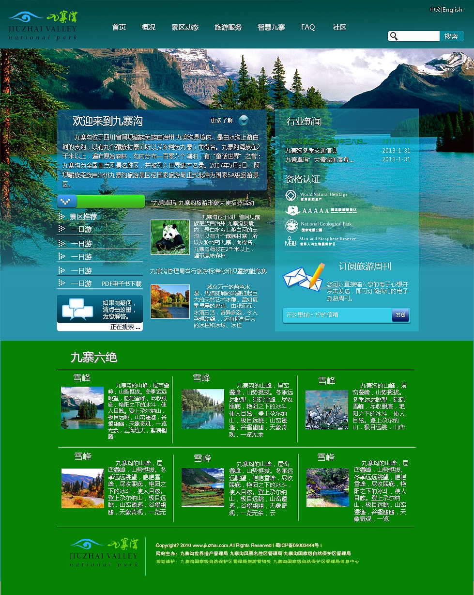 一想到旅游,很容易讓人聯(lián)想到森林、公園、海洋等,綠色、藍(lán)色都很適合這類站點(diǎn)。這類站點(diǎn)的插圖可以選擇名勝古跡、風(fēng)土人情等各種圖片,這些圖片放在網(wǎng)頁上會給人帶來憧憬。在主頁頂部插入景區(qū)的風(fēng)景圖,一下子就能讓人感覺到景區(qū)的外貌和周圍的風(fēng)景,吸引人的注意力。下圖所示為旅游網(wǎng)站。