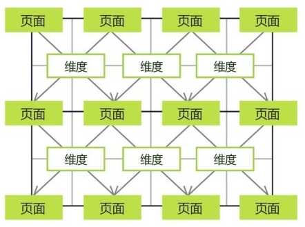 矩陣結(jié)構(gòu)(見圖3)是一種提供多種導(dǎo)航方式來協(xié)肋用戶到達(dá)目標(biāo)頁面的結(jié)構(gòu)模式,矩陣中的“節(jié)點(diǎn)”是指頁面,“軸”則是指用戶到達(dá)目標(biāo)頁面的方式。該矩陣結(jié)構(gòu)的特點(diǎn)就是允許用戶在節(jié)點(diǎn)與節(jié)點(diǎn)之間沿著兩個(gè)或更多的“維度”移動(dòng),通常能幫助那些“帶著不同需求而來”的用戶,使他們能在一個(gè)頁面中尋找各自想要的東西。此結(jié)構(gòu)常用于系統(tǒng)管理網(wǎng)站和電子商務(wù)網(wǎng)站。