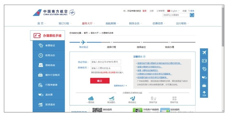 圖6 南方航空公司官網(wǎng)上辦理乘機(jī)手續(xù)的頁面