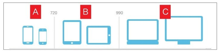 第一種基于設(shè)備的模式是通過(guò)主流設(shè)備的類(lèi)型及尺寸來(lái)確定布局?jǐn)帱c(diǎn)(見(jiàn)圖6),從而設(shè)計(jì)多套樣式,再分別投射到響應(yīng)的設(shè)備。如你的頁(yè)面主要兼容的設(shè)備為手機(jī)、平板、桌面電腦3種,那么就需要根據(jù)主流手機(jī)分辨率尺寸設(shè)置兩個(gè)斷點(diǎn)。下圖中設(shè)置的斷點(diǎn)是720像素與990像素,即若你的屏幕寬度小于720像素的將會(huì)出現(xiàn)A的版式,而當(dāng)寬度大于等于720像素且小于990像素的將會(huì)出現(xiàn)B的版式,大于990像素則會(huì)顯示C的版式。