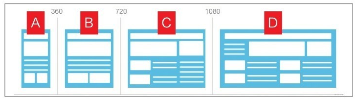第二種基于內(nèi)容優(yōu)先的模式是根據(jù)內(nèi)容的可讀性、易讀性作為確定斷點(diǎn)的標(biāo)準(zhǔn)(見(jiàn)圖7),從小到大共設(shè)計(jì)了A、B、C、D4種版式,在對(duì)內(nèi)容進(jìn)行布局設(shè)計(jì)的時(shí)候,我們首先是基于內(nèi)容來(lái)決定何時(shí)需要采用不同的呈現(xiàn)方式,再參考設(shè)備的物理尺寸,最終確定斷點(diǎn)數(shù)值分別為360像素、720像素、1080像素。