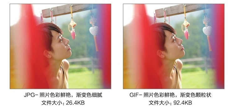 以一張450像素×390像素的照片切圖為例,分別輸出JPG、GIF兩種格式(見(jiàn)圖6)來(lái)做個(gè)對(duì)比。兩張圖的清晰程度相當(dāng),但GIF格式中的漸變色呈顆粒狀,文件大小為92.4KB,JPG格式漸變色過(guò)渡自然,文件大小僅為26.4KB,顯然JPG格式更適合儲(chǔ)存色彩豐富具有漸變色的照片圖像。