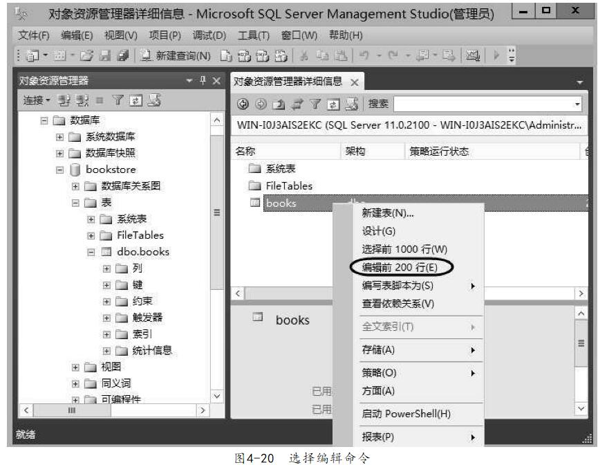 (1)在SQLServerManagementStudio中,展開“數(shù)據(jù)庫”節(jié)點,選中要使用的數(shù)據(jù)庫如bookstore,然后展開該數(shù)據(jù)庫的“表”節(jié)點,用鼠標右鍵單擊要添加數(shù)據(jù)的表如books表。在彈出的快捷菜單中選擇“編輯前200行”命令,如圖4-20所示。
