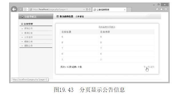 第4步,運行示例,在index.php頁面中單擊分頁公告信息超鏈接導(dǎo)航,打開page.php頁面,在該頁面中單擊底部的分頁超鏈接文本,可以快速瀏覽不同頁面信息,如圖19.43所示。