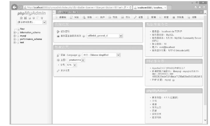 第3步,成功登錄之后進(jìn)入phpMyAdmin工具主界面,在phpMyAdmin工具主界面中可以看到本地MySQL數(shù)據(jù)庫(kù)以及服務(wù)器配置信息。在主界面左側(cè)是MySQL服務(wù)器中已經(jīng)定義的數(shù)據(jù)庫(kù),單擊可以打開(kāi)對(duì)應(yīng)的數(shù)據(jù)庫(kù),在主界面右側(cè)頂部顯示一行工具欄,利用這些工具按鈕,可以快速對(duì)MySQL數(shù)據(jù)庫(kù)進(jìn)行操作,主界面視圖如圖20.5所示。