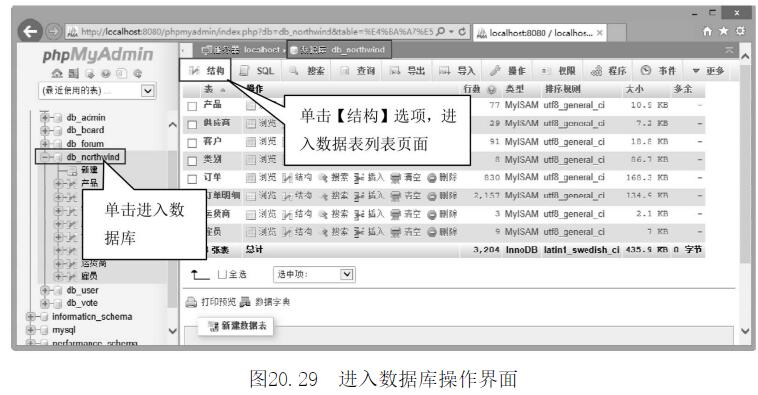 第2步,進(jìn)入數(shù)據(jù)庫以后,現(xiàn)在左邊的側(cè)邊欄里顯示著數(shù)據(jù)庫的各個(gè)表,單擊就可以進(jìn)入,也可以單擊右邊的圖標(biāo),如圖20.27所示。
