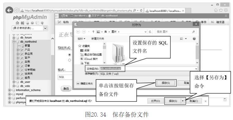 第3步,單擊【執(zhí)行】按鈕,此時(shí)瀏覽器會彈出保存提示條,從中選擇【另存為】命令,打開【另存為】對話框,把SQL文件保存到本地文件夾中,如圖20.34所示。