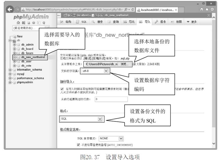 第3步,在頁面左側(cè)數(shù)據(jù)庫列表中,選擇新建的數(shù)據(jù)庫,在右側(cè)內(nèi)容區(qū)域單擊【瀏覽】按鈕,瀏覽文件位置,選擇一個(gè)數(shù)據(jù)庫文件(db_northwind.sql),注意擴(kuò)展名為sql,然后設(shè)置文件的字符編碼,確保與備份數(shù)據(jù)庫字符編碼一致,設(shè)置“格式”為SQL,設(shè)置如圖20.37所示。
