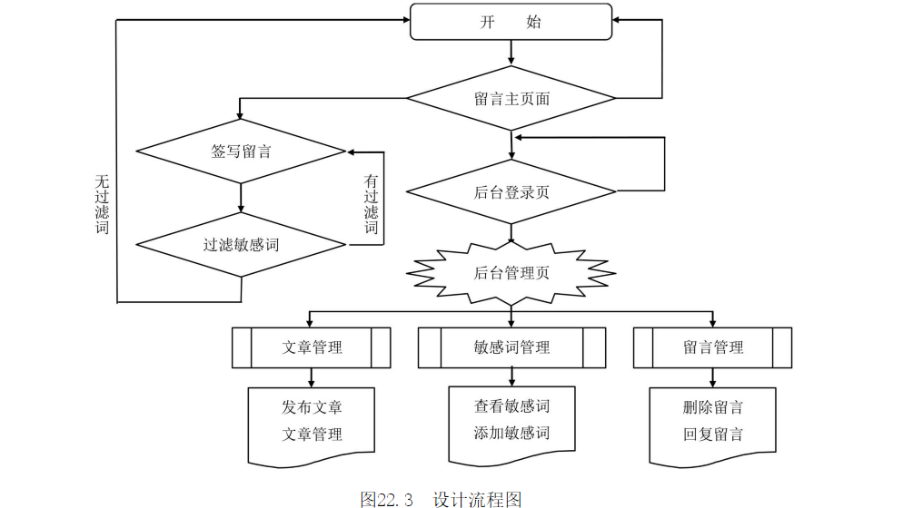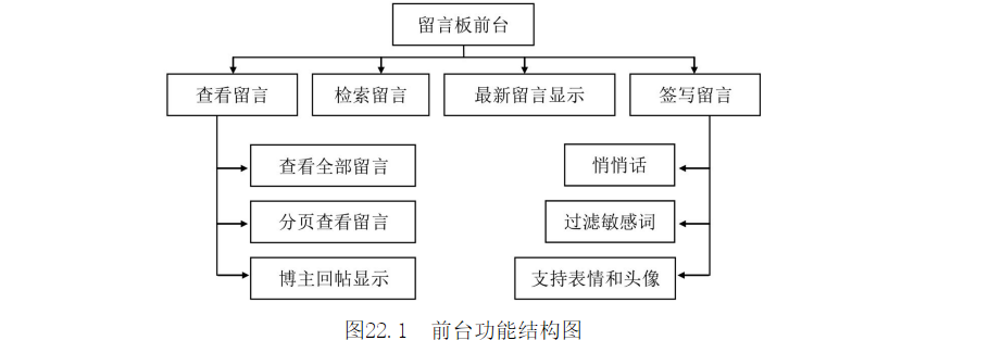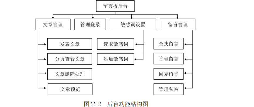 圖22.1 前臺(tái)功能結(jié)構(gòu)圖留言板的后臺(tái)主要功能結(jié)構(gòu)如圖22.2所示。