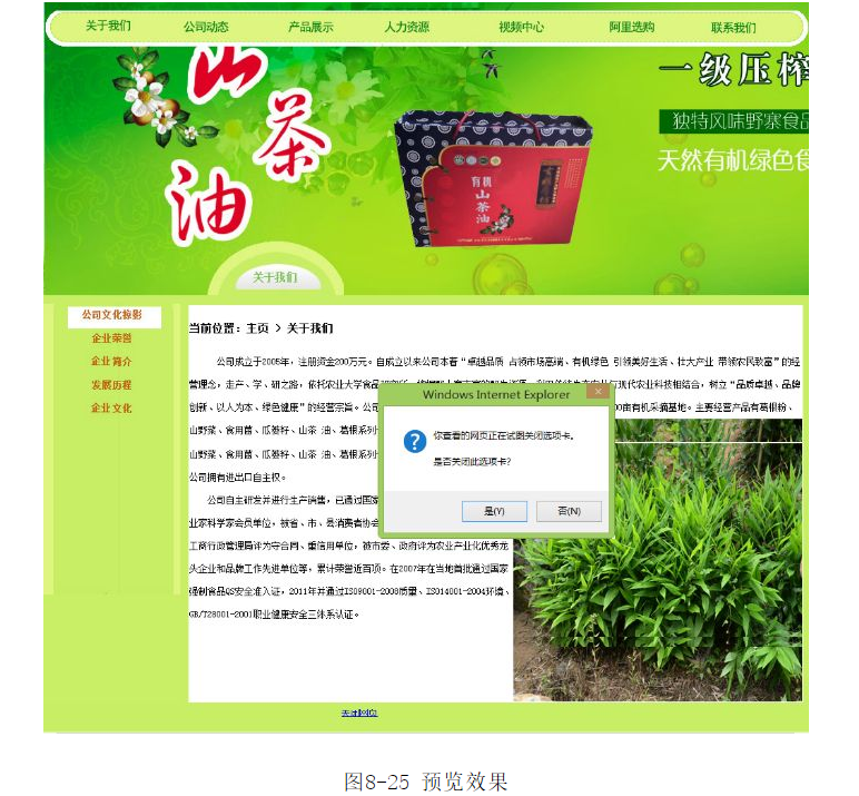 ?保存文檔,按F12鍵在瀏覽器中預(yù)覽效果。單擊“關(guān)閉網(wǎng)頁(yè)”超文本鏈接,會(huì)自動(dòng)彈出一個(gè)提示對(duì)話框,詢(xún)問(wèn)是否關(guān)閉窗口,單擊【是】按鈕,即可關(guān)閉網(wǎng)頁(yè),如圖8-25所示。