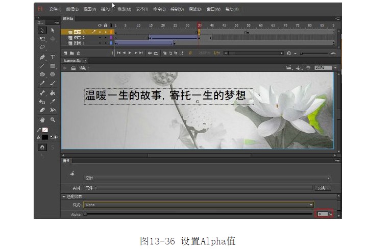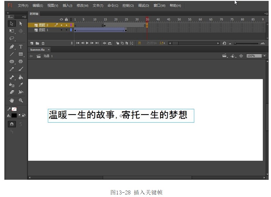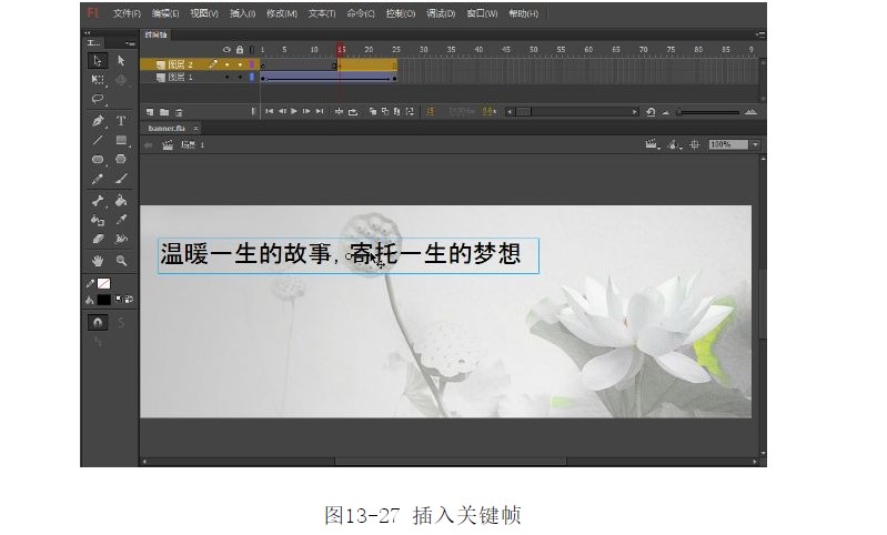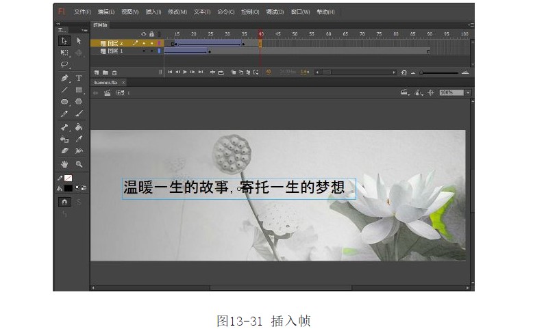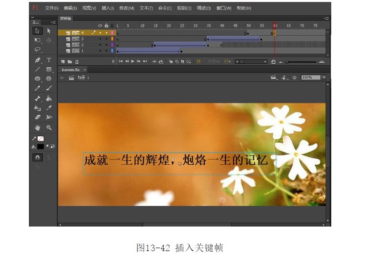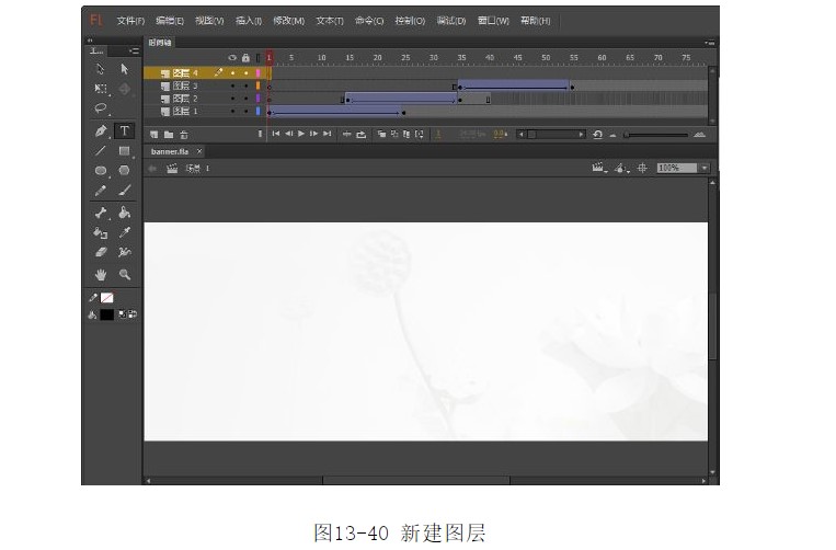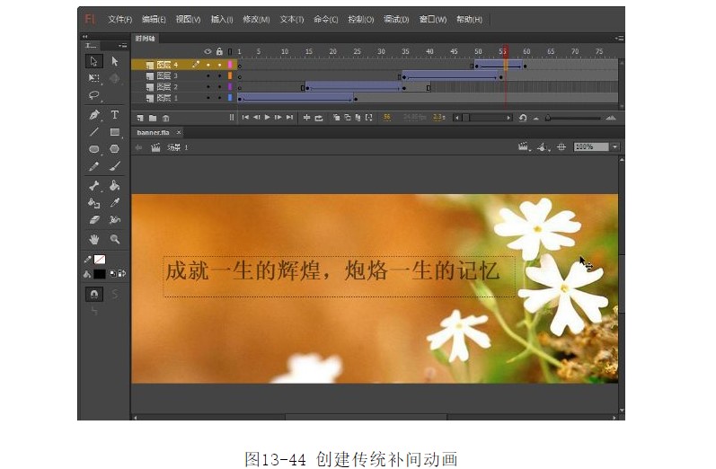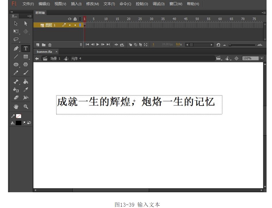 32.單擊【確定】按鈕,進(jìn)入元件4的編輯模式。選擇工具箱中的文本工具,在舞臺(tái)中輸入文字,并調(diào)整其位置,如圖13-39所示。