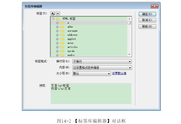 圖14-2【標(biāo)簽庫編輯器】對話框,好了,網(wǎng)站設(shè)計公司本文關(guān)于“網(wǎng)站設(shè)計動態(tài)頁面怎樣在Dreamweaver中編寫代碼?”的相關(guān)知識就分享到這里,謝謝關(guān)注,博納網(wǎng)絡(luò)編輯整理。[聲明]本網(wǎng)轉(zhuǎn)載網(wǎng)絡(luò)媒體稿件是為了傳播更多的信息,此類稿件不代表本網(wǎng)觀點,本網(wǎng)不承擔(dān)此類稿件侵權(quán)行為的連帶責(zé)任。故此,如果您發(fā)現(xiàn)本網(wǎng)站的內(nèi)容侵犯了您的版權(quán),請您的相關(guān)內(nèi)容發(fā)至此郵箱【qin@198bona.com 】,我們在確認后,會立即刪除,保證您的版權(quán)。