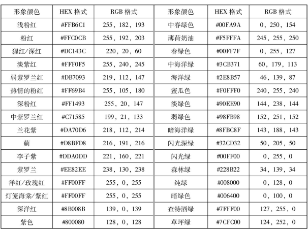 網(wǎng)站上的各種色彩,是通過(guò)用數(shù)字形態(tài)來(lái)模擬三原色調(diào)配得出的。通過(guò)表2-1,可以快速地索引和使用一些自然界中的常用顏色在電腦中的表示方法。