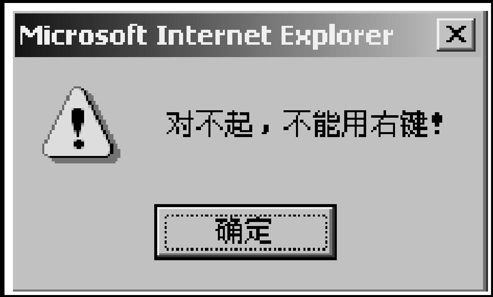 (2)屏蔽鼠標右鍵。它的顯示源文件功能即在所需保護的頁面文件(上例中為index.html文件)中加入以下代碼(當(dāng)右鍵被單擊時將出現(xiàn)圖8.1所示提示框)。