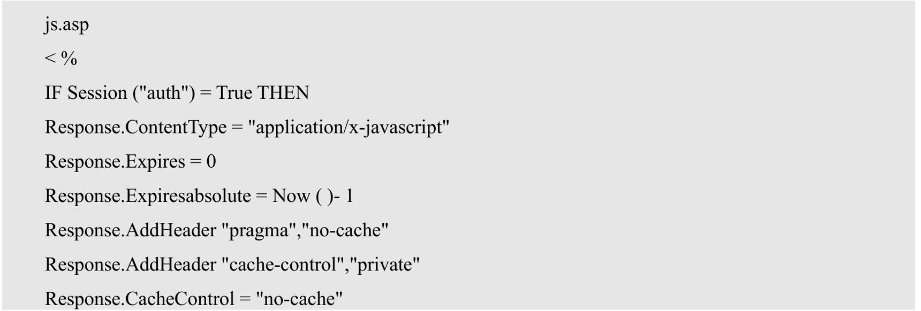 這個案例涉及三個文件:index.asp,js.asp和global.asa。global.asa定義了一個auth會話變量,該變量用于驗證請求JavaScript源文件的頁面起源是否合法。這里選擇會話變量的原因在于它使用起來比較方便。