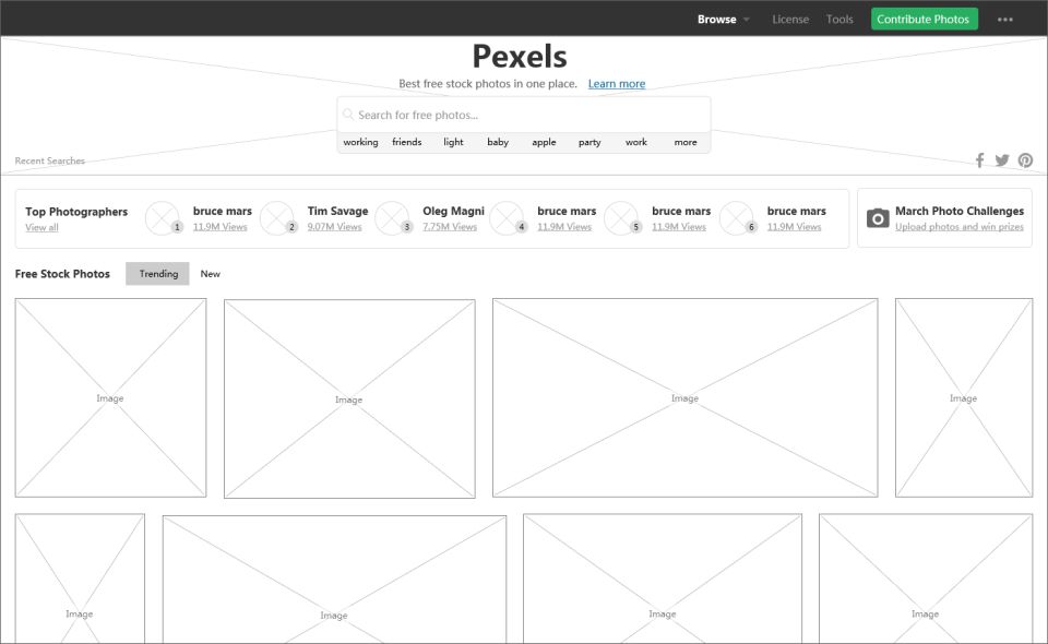 參考點:圖片瀑布流設(shè)計Pexels是一個高清圖片下載服務(wù)站點,為用戶提供海量共享圖片素材的網(wǎng)站,每周都會定量更新。網(wǎng)站首頁采用懸浮設(shè)計,將菜單欄和底部欄都是懸浮在固定位置,內(nèi)容區(qū)域滾動。首頁圖片排列采用瀑布流的方式,多圖片滾動。包含的頁面有:瀏覽頁,下載頁,注冊頁,登陸頁。
