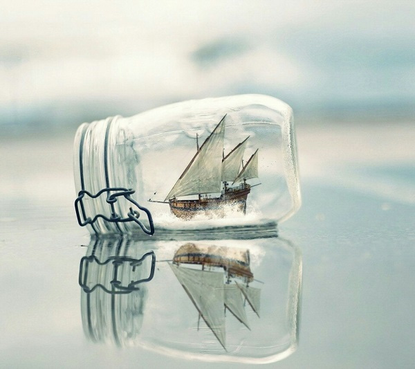 對(duì)!你沒(méi)看錯(cuò)!過(guò)度模糊的圖片也是一種留白,雖然圖片里含有信息元素,但由于被虛化得看不真切,相當(dāng)于被藏起來(lái)了,所以也能看作是留白。背景虛化在攝影上用得尤為廣泛,像以下這幅圖片,將景深變淺,視覺(jué)聚焦在帆船瓶子,也讓畫面看起來(lái)通透純凈。