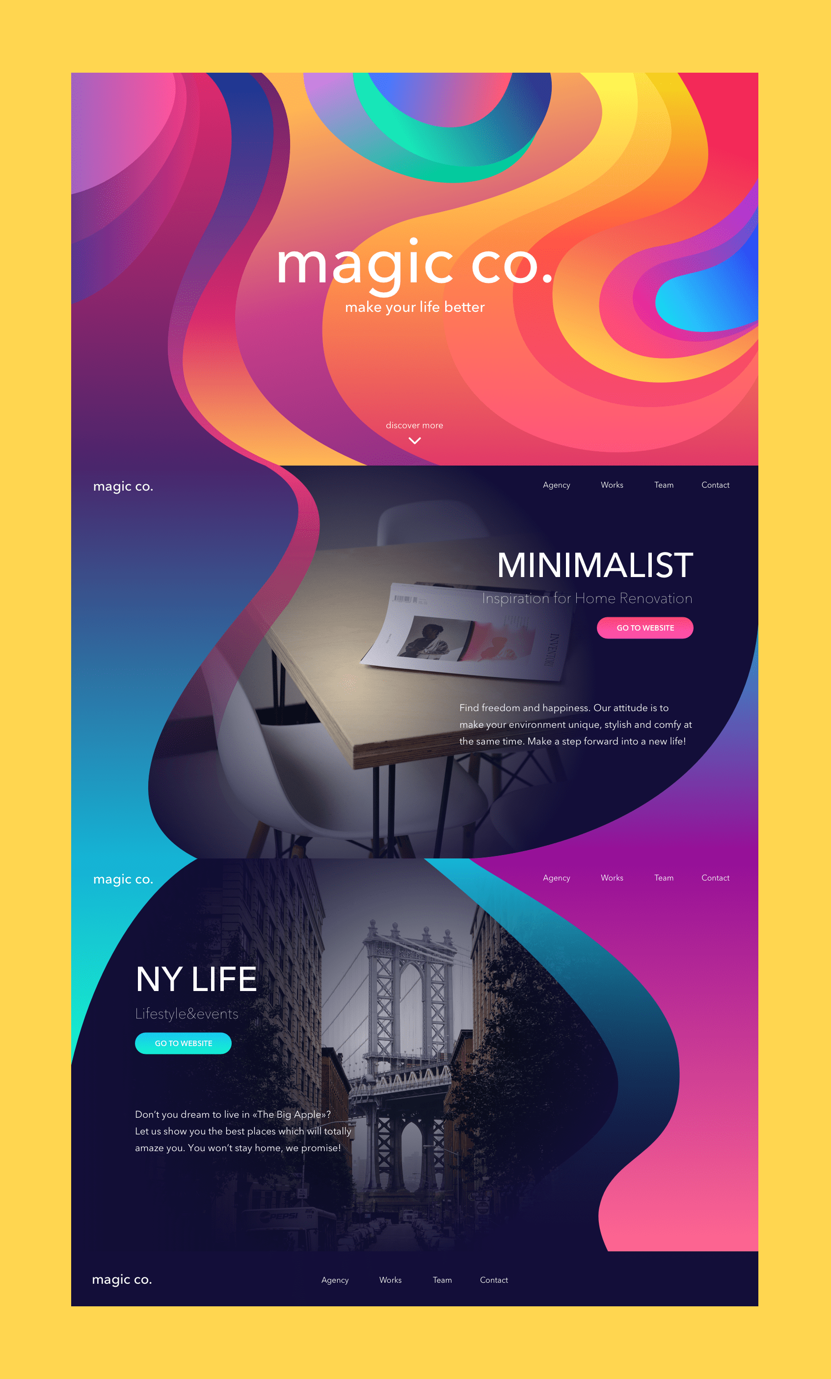 色彩的選取一直都是整個設計中最有趣的部分。由于是要創(chuàng)造出生動而又具有視覺吸引力的設計,設計師開始尋找漸變色的配色方案。想要專門強調特定的色彩并不容易,因為漸變色通常是多種色彩共同構成的,在具體的順序和搭配上有著多種變化,需要持續(xù)地嘗試和探索??傮w上而言,設計師是通過品牌和需求而確定了基礎的四種不同配色方案,再在其中挑選出對比度和協(xié)調度都比較高的組合。最終,她所通過之前的探索,確定使用曲線波紋來構建背景圖形。在這樣的項目當中,通過色彩來主導設計是一件很有趣的事情,同樣也是極具挑戰(zhàn)性的任務。至于這個流程,按照 Ludmila 的說法,她是在單獨的頁面上進行漸變色彩的組合,仔細調整漸變色的過渡。她將注意力集中在色彩本身的選取上,確保整體的配色是干凈且富有活力的。