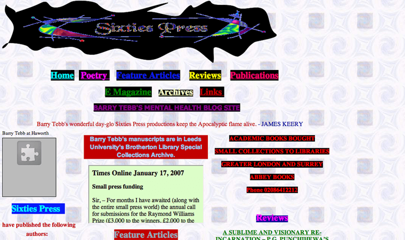 有的時(shí)候,專業(yè)的事情還是盡量讓專業(yè)的人來做吧。這個(gè)名為 Sixties Press 的網(wǎng)站看起來像是一個(gè)6歲的孩子拼貼起來的,但是實(shí)際上它的來頭極大:這是英國著名作家 James Duval 親手設(shè)計(jì),用來推銷詩歌圖書的網(wǎng)站。很難想象他通過這個(gè)網(wǎng)站能賣得出去書。當(dāng)然,現(xiàn)在打開這個(gè)網(wǎng)站,已經(jīng)不再使用上圖中這個(gè)邪教般的設(shè)計(jì)了。