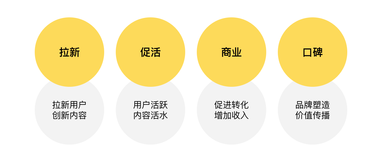 1. 拉新(拉新用戶 創(chuàng)新內(nèi)容)通過傳播吸引新用戶,讓平臺(tái)在短的時(shí)間內(nèi),用戶指數(shù)實(shí)現(xiàn)增長(zhǎng)。用戶體量越大,越需要持續(xù)的拉新、拉新、再拉新。新用戶創(chuàng)造新內(nèi)容,新內(nèi)容再持續(xù)的吸引新的用戶,平臺(tái)上創(chuàng)造出越來越多的新內(nèi)容。