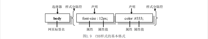 (2)CSS基本語(yǔ)法樣式是CSS最小語(yǔ)法單元,每個(gè)樣式包含兩部分內(nèi)容:選擇器和聲明(或稱為規(guī)則),如圖