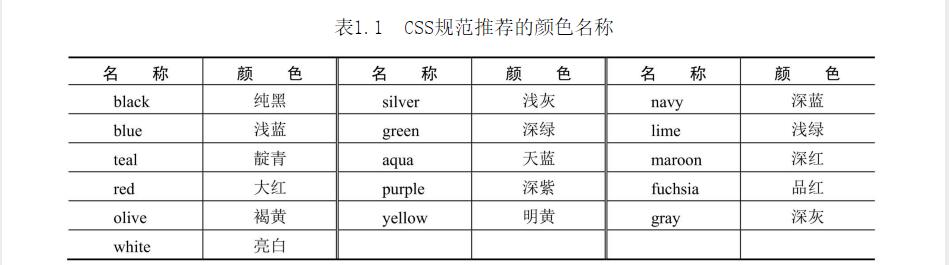 ? 使用顏色名是最簡單的方法。雖然目前已經(jīng)命名的顏色約有184種,但真正被各種瀏覽器支持,并且作為CSS規(guī)范推薦的顏色名稱只有16種,如表1.1所示。不建議在網(wǎng)頁中使用顏色名,特別是大規(guī)模的使用,避免有些顏色名不被瀏覽器解析,或者不同瀏覽器對顏色的解釋差異。