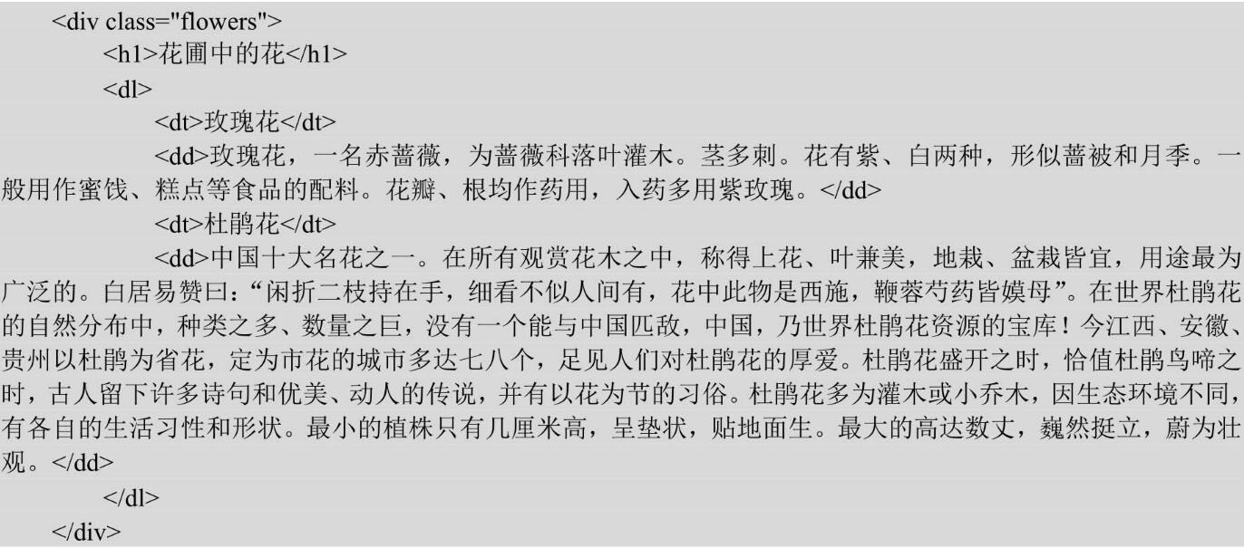 一般列表信息需要添加一個標(biāo)題,自定義列表<dl>中的內(nèi)容主要是通過自定義列表的標(biāo)題和內(nèi)容讓閱讀者明白該列表介紹的信息。當(dāng)向他人介紹花圃中花的品種時,先說明主題,其次再分別介紹花的種類以及針對不同種類的花進行詳細(xì)的介紹,預(yù)覽如圖4.7所示。