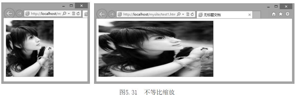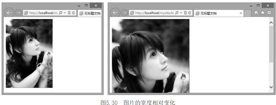 圖片的寬度相對變化這里需要指出的是,在此例中僅僅設(shè)置了圖片的width屬性,而沒有設(shè)置height屬性,但是圖片的大小會等縱橫比例縮放,如果只設(shè)定了height屬性而沒有設(shè)置width屬性道理也是一樣的。