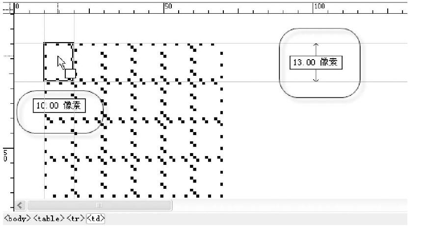網(wǎng)站設(shè)計(jì)豎線處理第2步,由于Dreamweaver在插入表格時(shí)自動(dòng)在每個(gè)單元格中嵌入個(gè)空格符號(hào) ,,用來撐大單元格,當(dāng)插入元素時(shí),空格消失。所以在沒有輸入任何元素時(shí),單元格最小寬度為10像素,最小高度為13像素,如圖6-34所示(放大為400%后效果)。