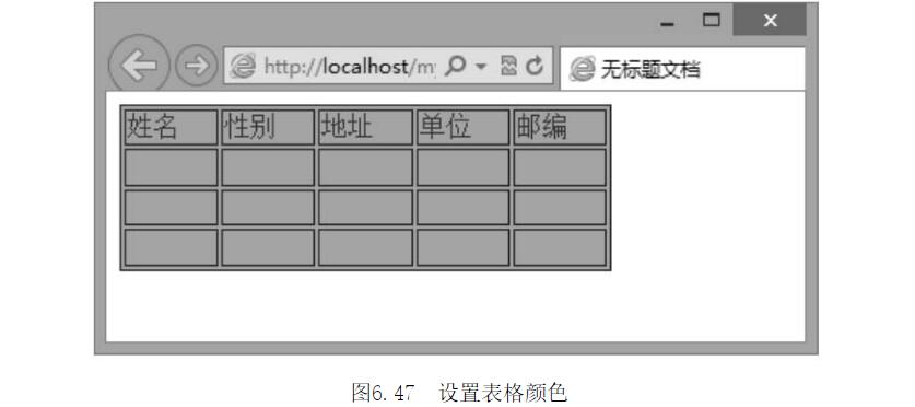 上面代碼中用<table>標簽創(chuàng)建了個表格設(shè)置表格的寬度為300.表格的邊框?qū)挾葹?.這里沒有給出單位,默認為px。使用<tr>和<td>標簽創(chuàng)建了4行5列的表格。可以看到,表格的背景顏色和字體顏色通過css進行了設(shè)置。顯示效果如圖6-47所示。