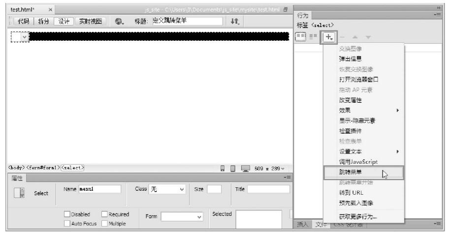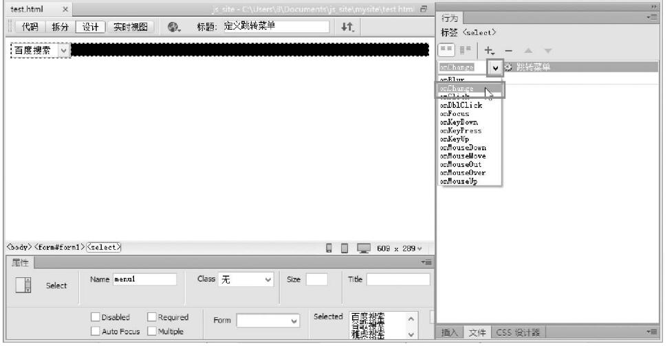 第7步,設置完畢,這時可以看到在【行為】中自動定義了“跳轉菜單”行為根據(jù)需要設置事件類型,這里設置honChange.即當跳轉菜單的值發(fā)生變化時,將觸發(fā)跳轉行為,如圖7.6所示。