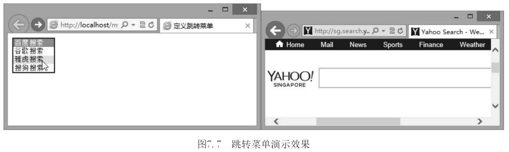 第8步,保存頁面,在瀏覽器中預覽,可以看到個跳轉下拉菜單,當選擇不同的搜索引擎時,會自動跳轉到該搜索引擎主頁,如圖7.7所示.