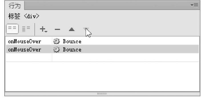 第7步,在【行為】面板中修改事件類型,單擊左側(cè)的onClick,從彈出的下拉菜單中選擇onMouseOver,即設(shè)計(jì)當(dāng)鼠標(biāo)經(jīng)過(guò)時(shí),將觸發(fā)彈跳特效,然后單擊向下箭頭按鈕,把當(dāng)前行為移到下面,讓該行為在上步定義的行為之后發(fā)生,設(shè)置如圖7-57所示。