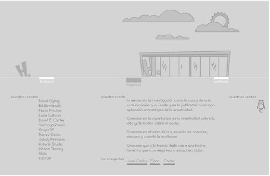 整個頁面效果如同古老的黑白照。初看該頁面容易把背景的源灰色誤認為是黑色,再仔細觀看就感覺到了此種深灰色不凡的作用,假如背景色使用了黑色,頁面的主體人物和空間感的相互作用就變得僵硬且呆板。
