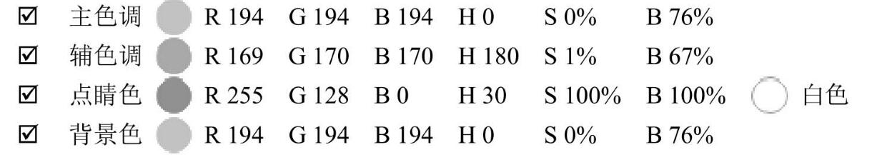 從RGB所呈現(xiàn)的均衡數(shù)值及HSB模式的HS都為。來看,主色調(diào)的淺灰色屬于非常純凈的非色彩,沒有摻雜其他色系進去。而輔色調(diào)的兩個模式上就有些差異,HSB模式的H顯示180。色相上偏青藍色,有及其微弱的飽和度,明度也較低。