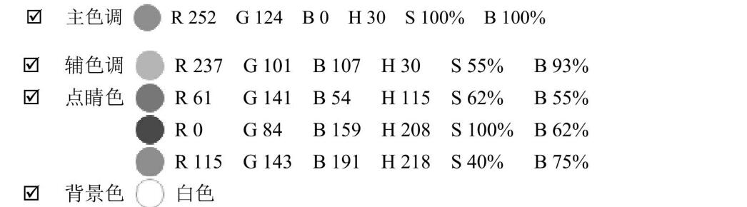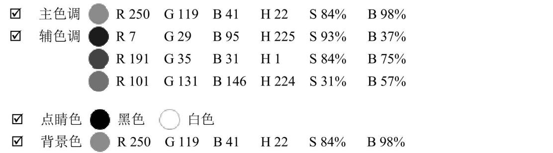 HSB數(shù)值中的H色相顯示主色調橙紅色為26,因為正紅色的H為。,正橙H為30,主色調橙紅色是往。偏移而得。正藍色是240.而該點睛色藍色為192.往綠度偏移,在RGB中的數(shù)值G160也能看出來,因此藍色的特性不是很強。但由于橙紅色的明度和飽和度達到最高值,因此盡管藍色不是正藍,但它的特性得到了很大程度的發(fā)揮。